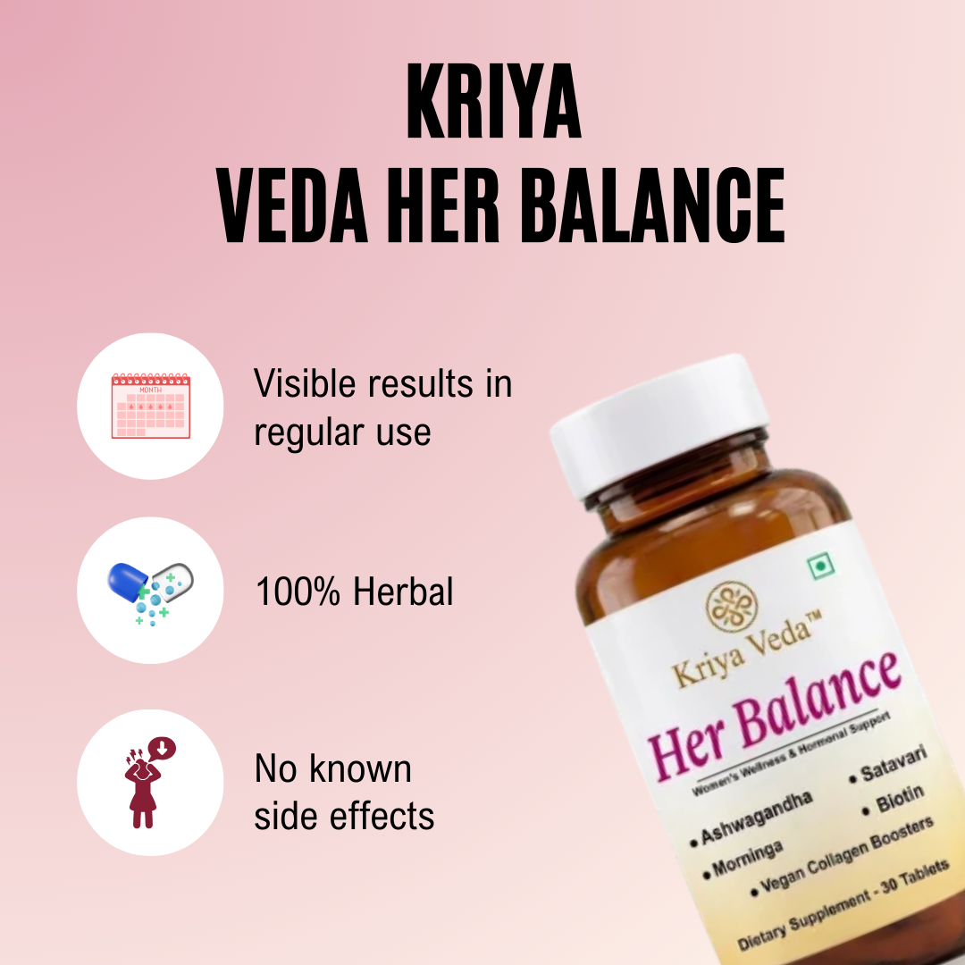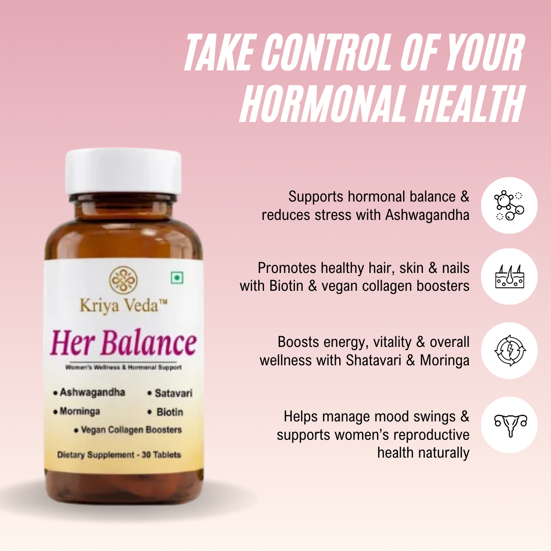 Kriya Veda – Her Balance is a gentle yet powerful expression of nature’s wisdom, thoughtfully created to support a woman’s complete well-being. Rooted in authentic Ayurvedic principles and refined with modern nutraceutical understanding, Her Balance works in harmony with the female body rather than forcing change.